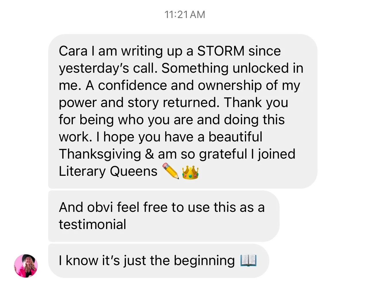 “Cara's literary coaching takes a blah blog to a sparkling substack with her keen eye and bestie coaching energy your writing life will be inspired from snooze-letter to literary it girl. Cara snatched my branding, inspired my bookshelf with new reads, professionally edited my writing, and held space for me during a 1:1 call where I even uncovered the idea for my next writing project. I signed up a second time! Connect with Cara to rock your writing life!”