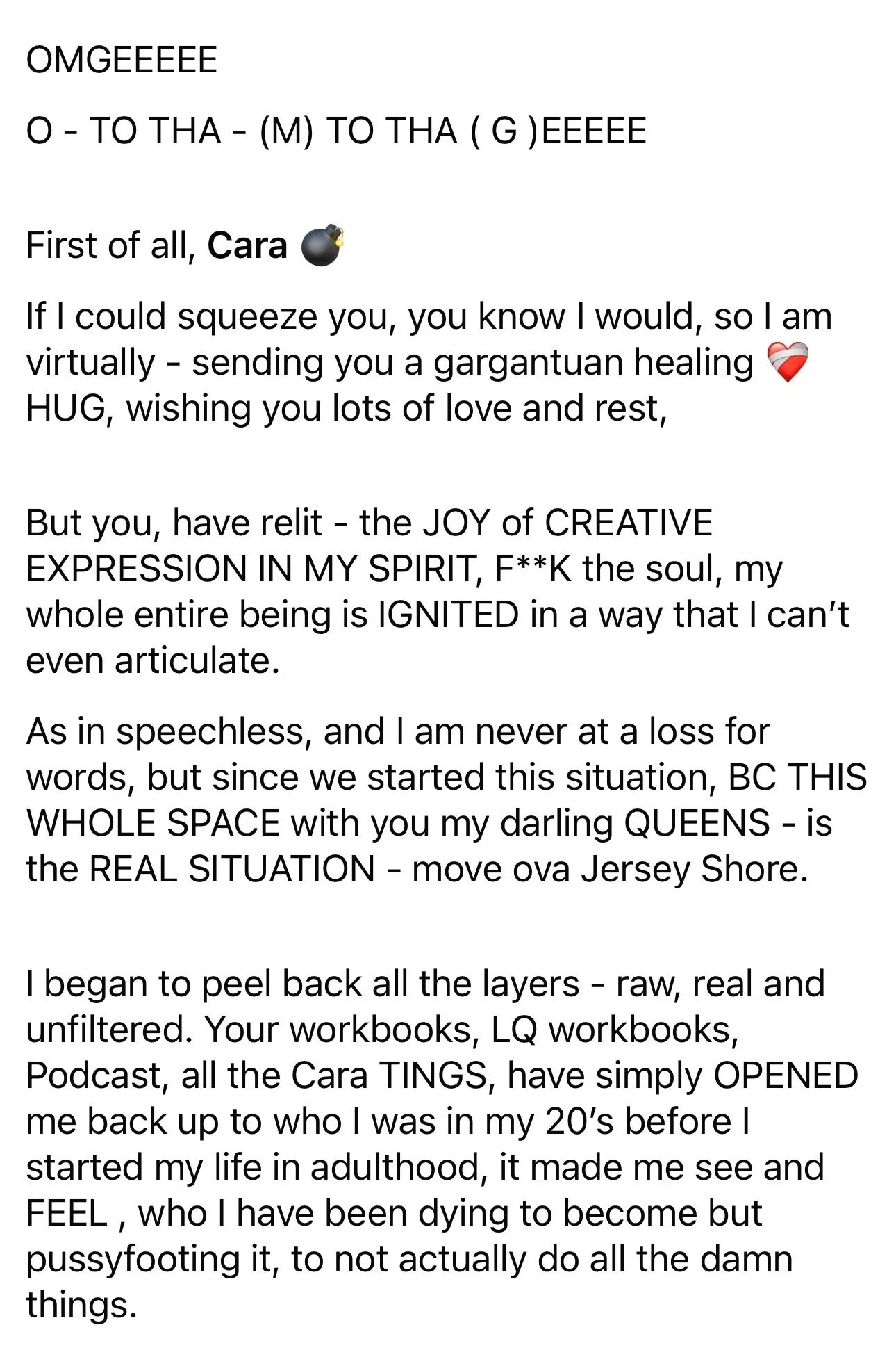 “I worked with Cara as I prepped for a huge project outside of my comfort zone: performing onstage with Generation Women at the iconic Joe’s Pub. She helped me turn my story from a kernel of an idea into an absolute Event — and brought the most supportive, excited, Go For It energy to each of our calls and to her feedback. Not only is she your creative sherpa, but she is the ultimate Hype Girl: someone that every writer needs in her corner. Working with Cara has helped me become more fearless in my writing, believe in myself more, and dive into a writing life that I’ve always dreamed of having.”