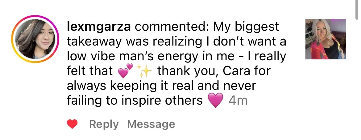 You will have live access to Cara to ask questions directly as you navigate break ups, dating, divorce, situationships, boundary setting, and discovering your worth